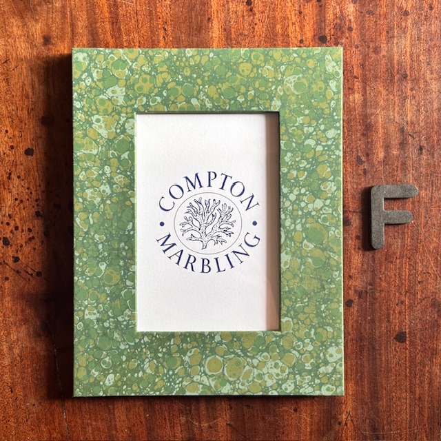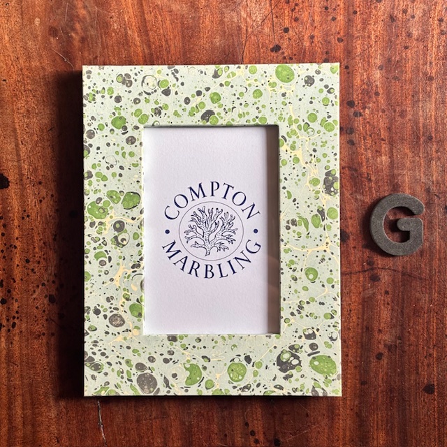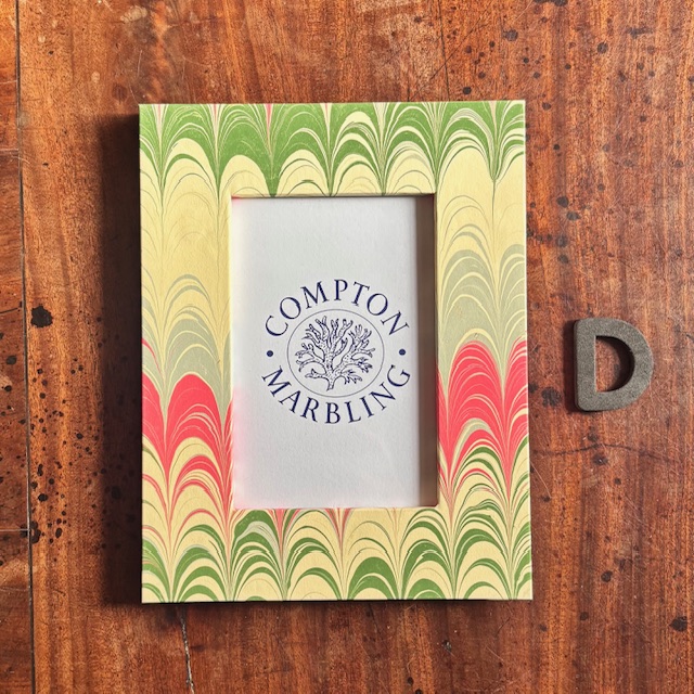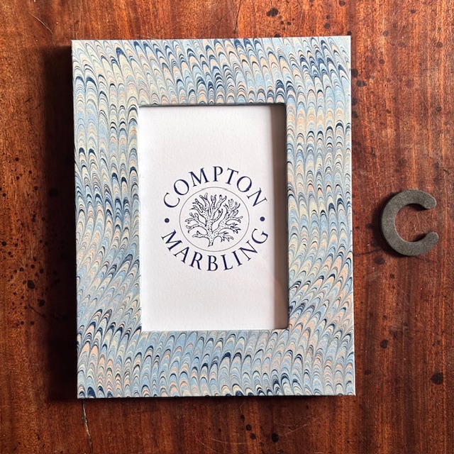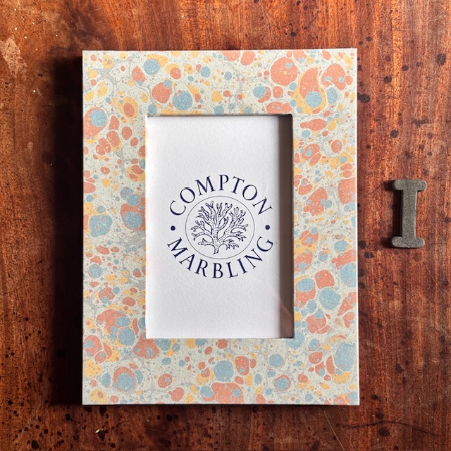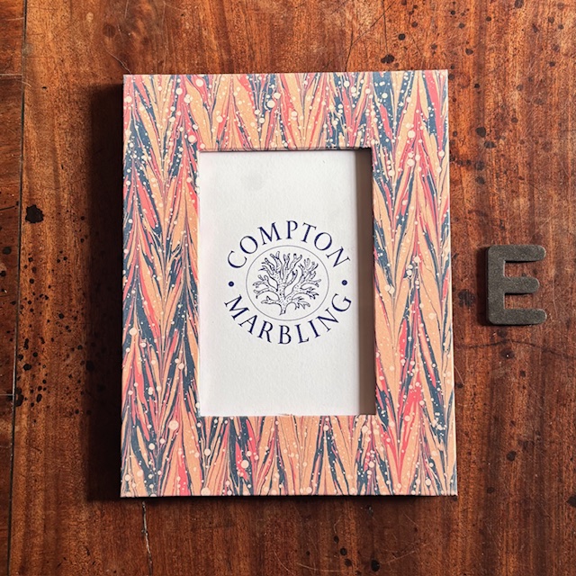Our Photograph frames are made of wood, with glass panes, bound front and back with our hand-marbled papers. We do four sizes, 6″ x 4″, 7″ x 5″ and 8″ x 6″ and A4. The hinged stand at the back allows them to stand landscape or portrait.