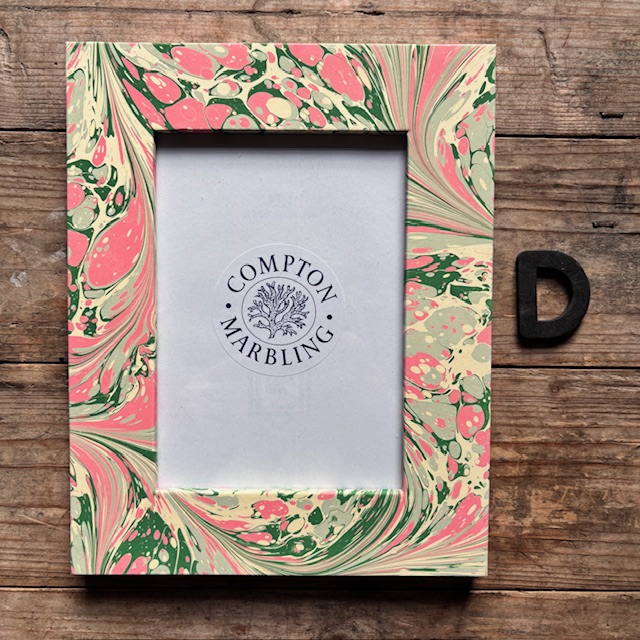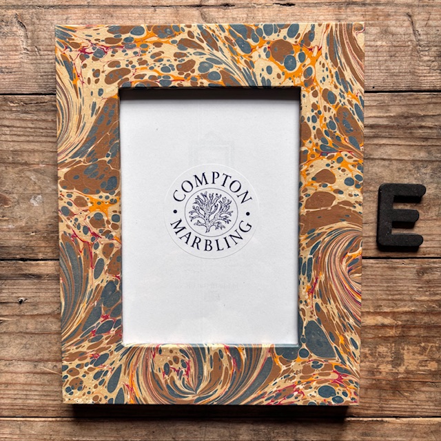 Our Photograph frames are made of wood, with glass panes, bound front and back with our hand-marbled papers. We do four sizes, 6″ x 4″, 7″ x 5″ and 8″ x 6″ and A4. The hinged stand at the back allows them to stand landscape or portrait.