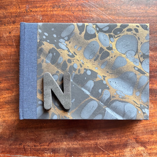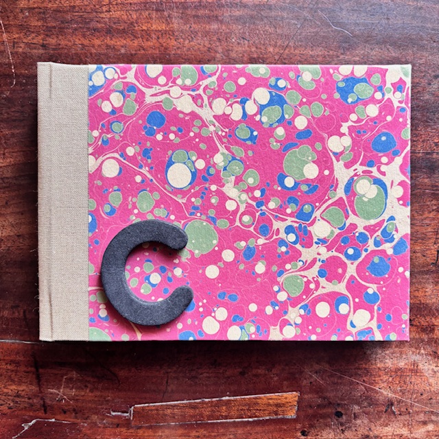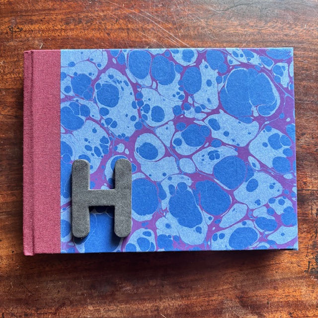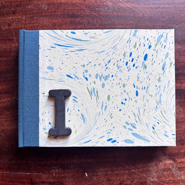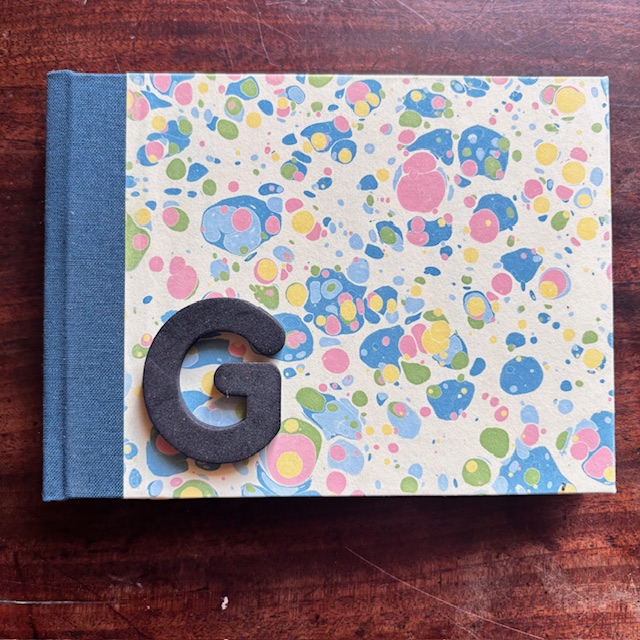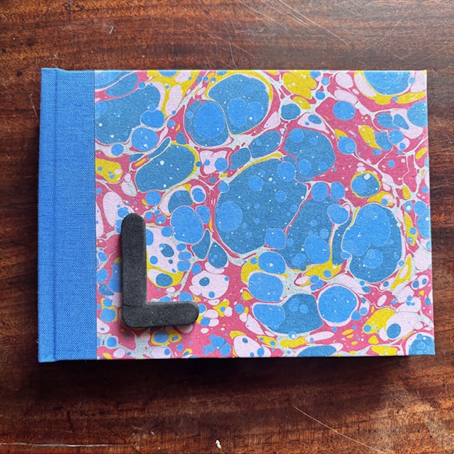A6 Landscape format sketchbook hand bound with our marbled paper with a cloth spine.
