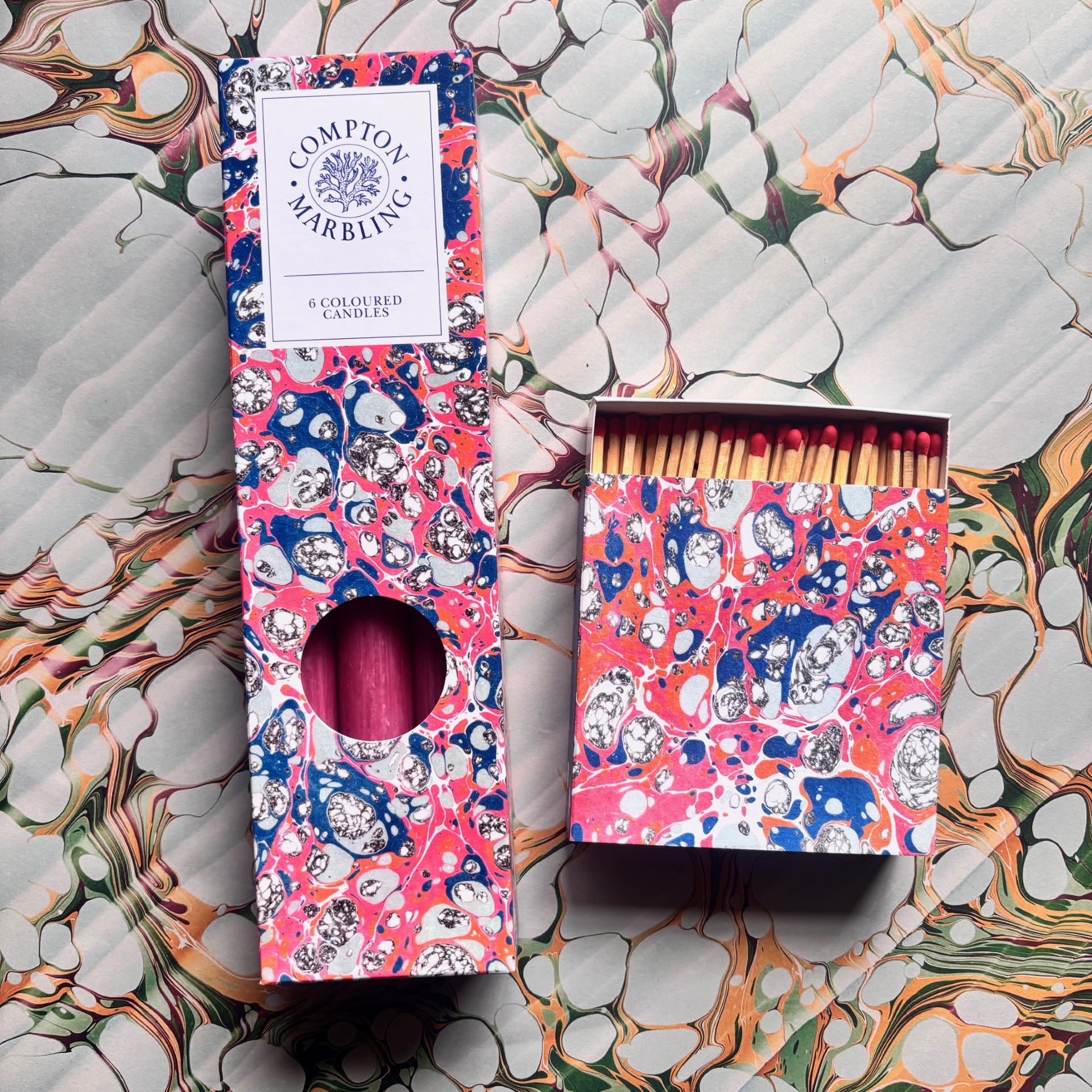 Coloured candles packaged in a printed marbled box & with a matching box of matches.