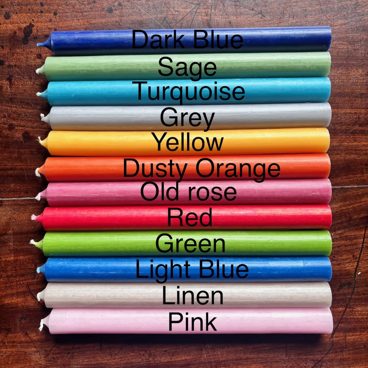 Candles: 12 colours to choose from: Dark Blue, Sage, Turquoise, Grey, Yellow, Dusty Orange, Old Rose, Red, Green, Light Blue, Linen, Pink