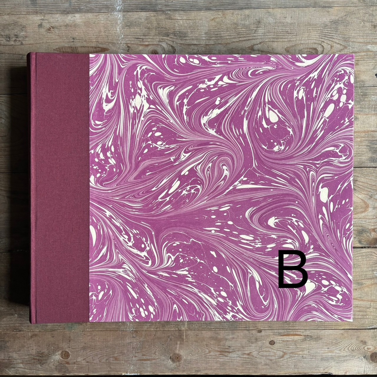 Our Tisbury albums have cream card pages and tissue between each page, and are available in extra-small (21cm x 16cm) 60 pages, small (23.5cm x 23.5cm) 80 pages, medium (33cm x 32cm) 80 pages, large (36cm x 36cm) 100 pages and extra-large (43cm x 36cm) 100 pages, in all our marbled papers. Every album is a one-off, and the range of prints available is constantly changing. Please see the images to see what is currently in stock.
