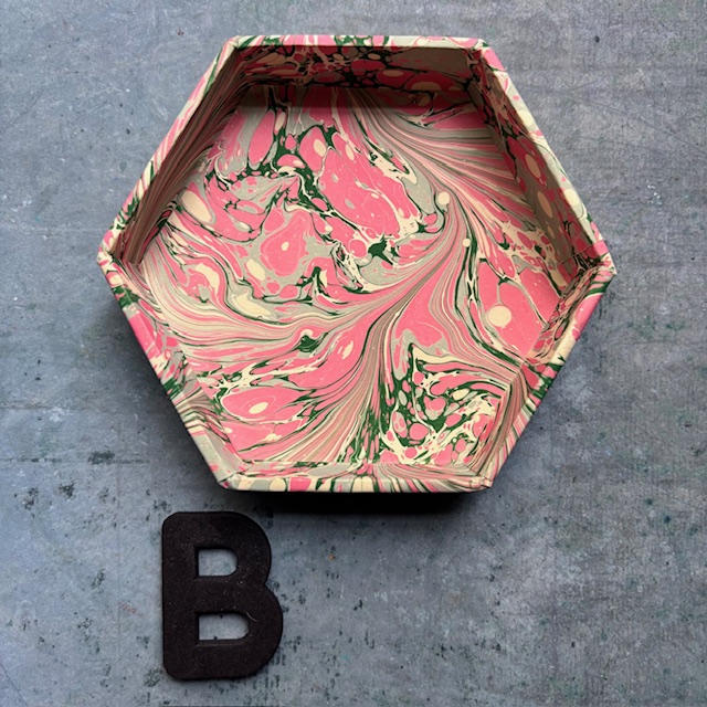 Stunning hexagonal trinket trays, covered in our hand marbled paper. A perfect desk tidy, somewhere to put your keys or a beautiful addition to your dressing table or just as a beautiful centre piece on a table. Size- 5″