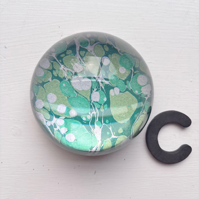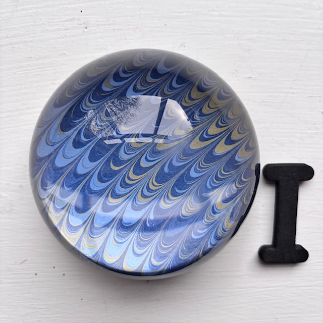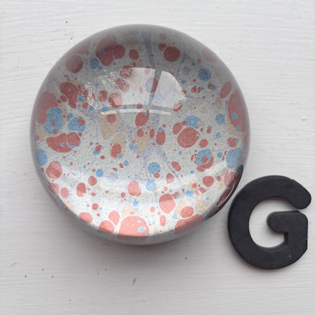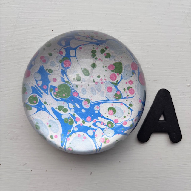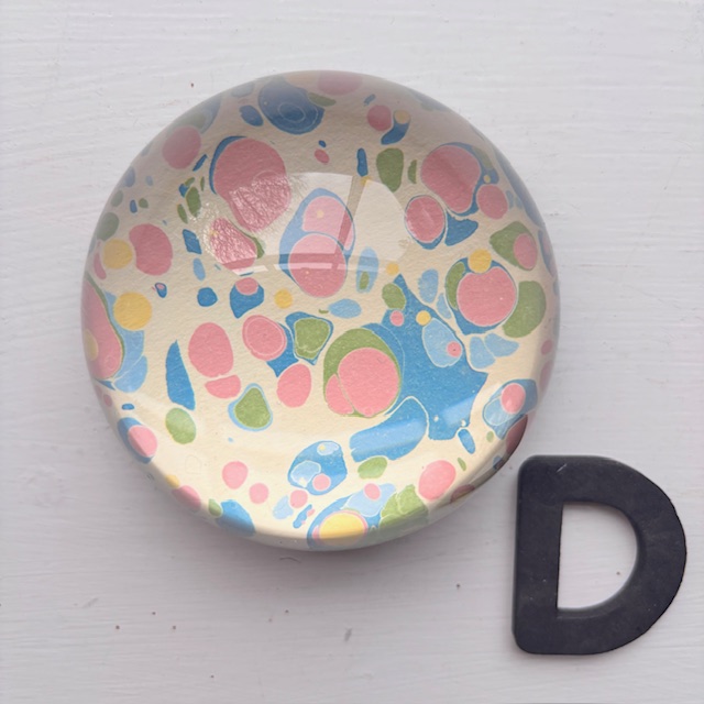 NEW: Clear glass domed paperweights with our hand marbled paper.