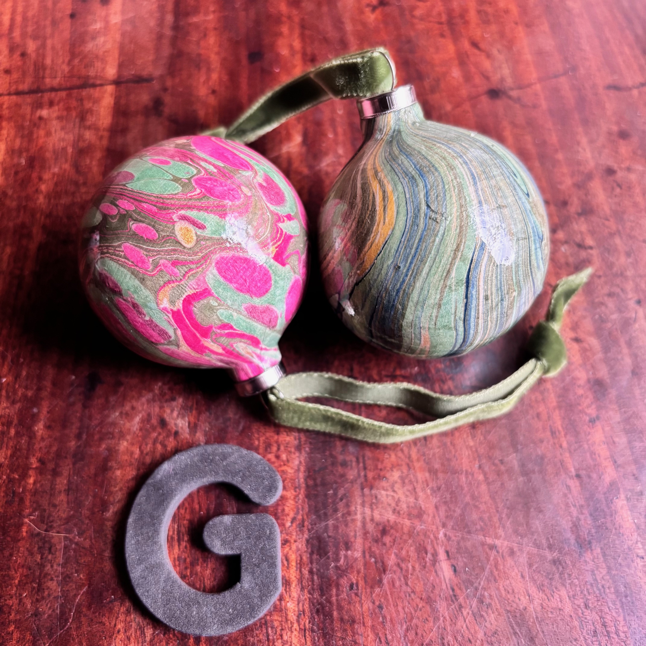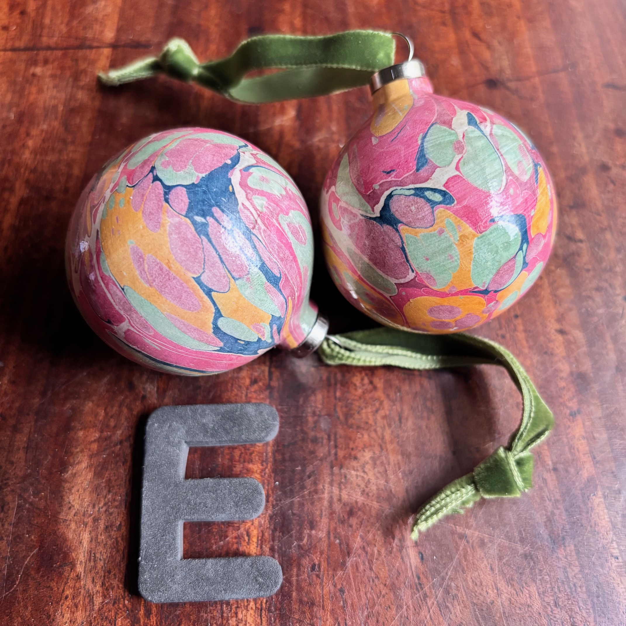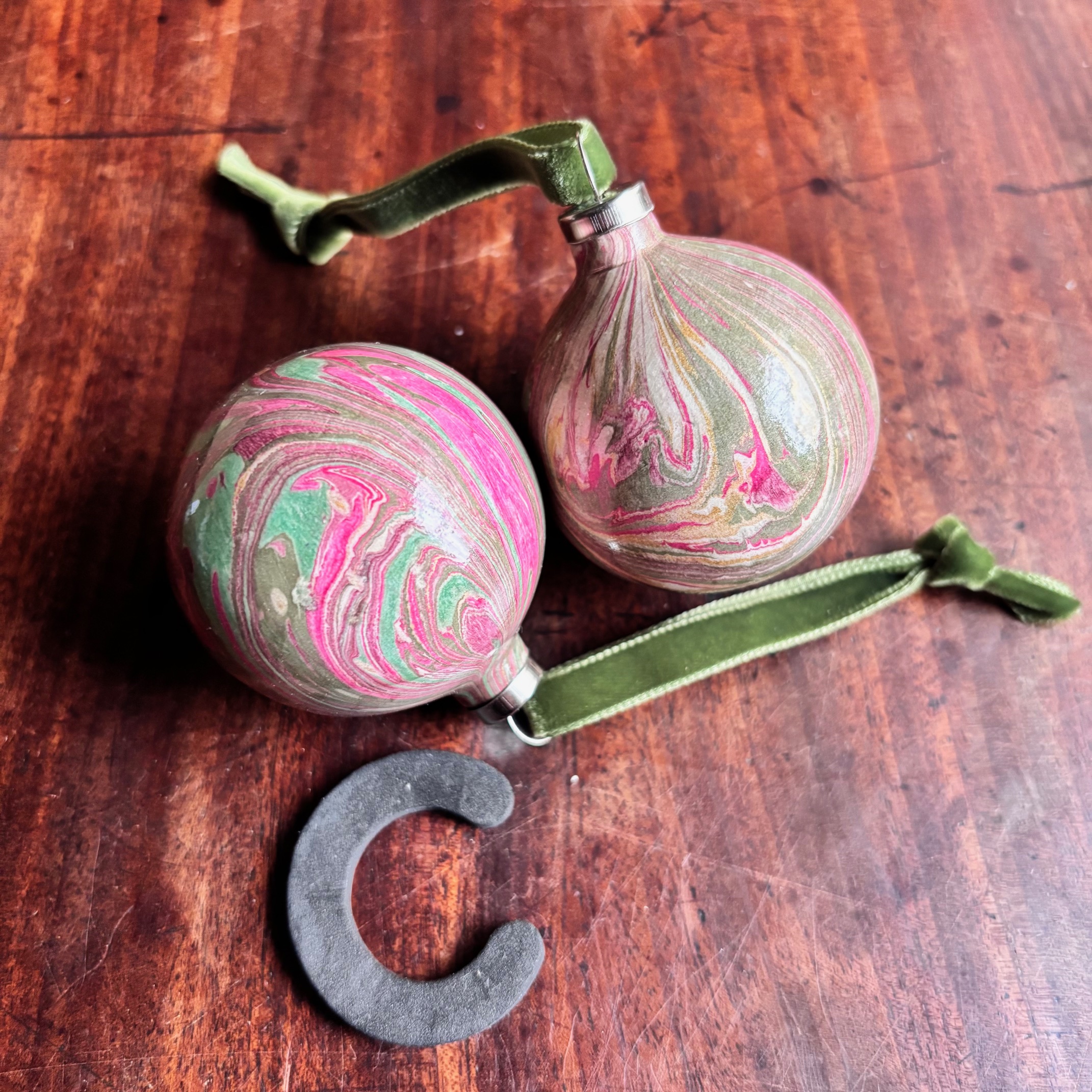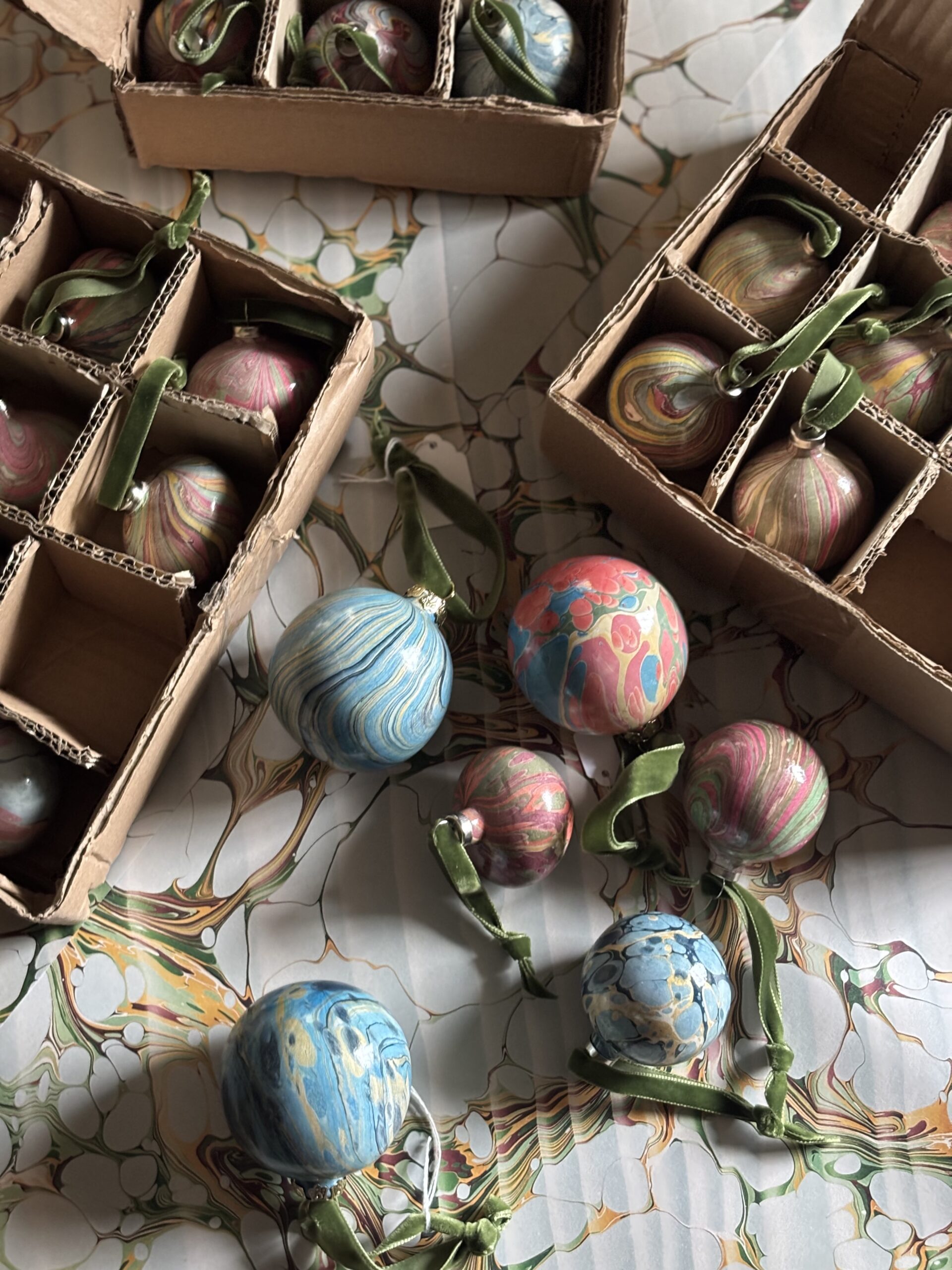Hand marbled ceramic baubles either to hang on your tree or decorate the Christmas table.