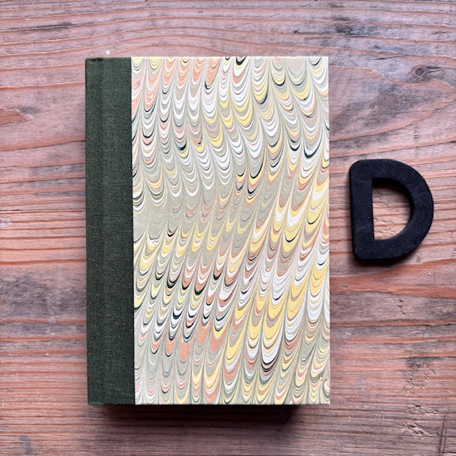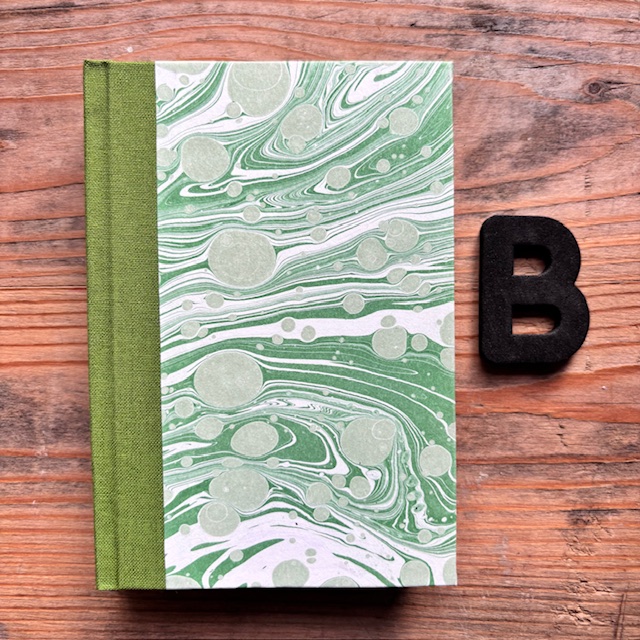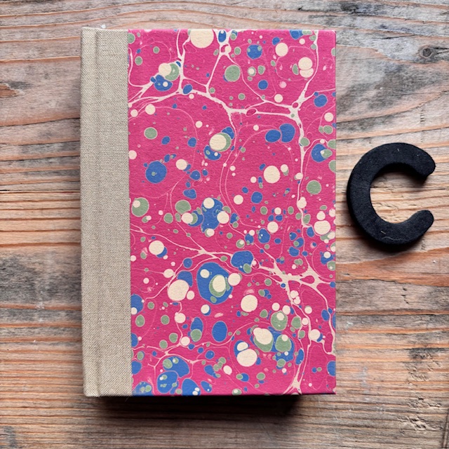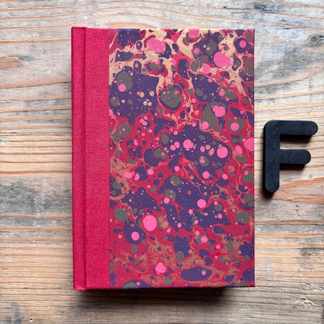 NEW: A new size hardback journal, small but with lots of pages! Covered with our hand marbled paper and bound with a coloured cloth spine. Perfect for your pocket!